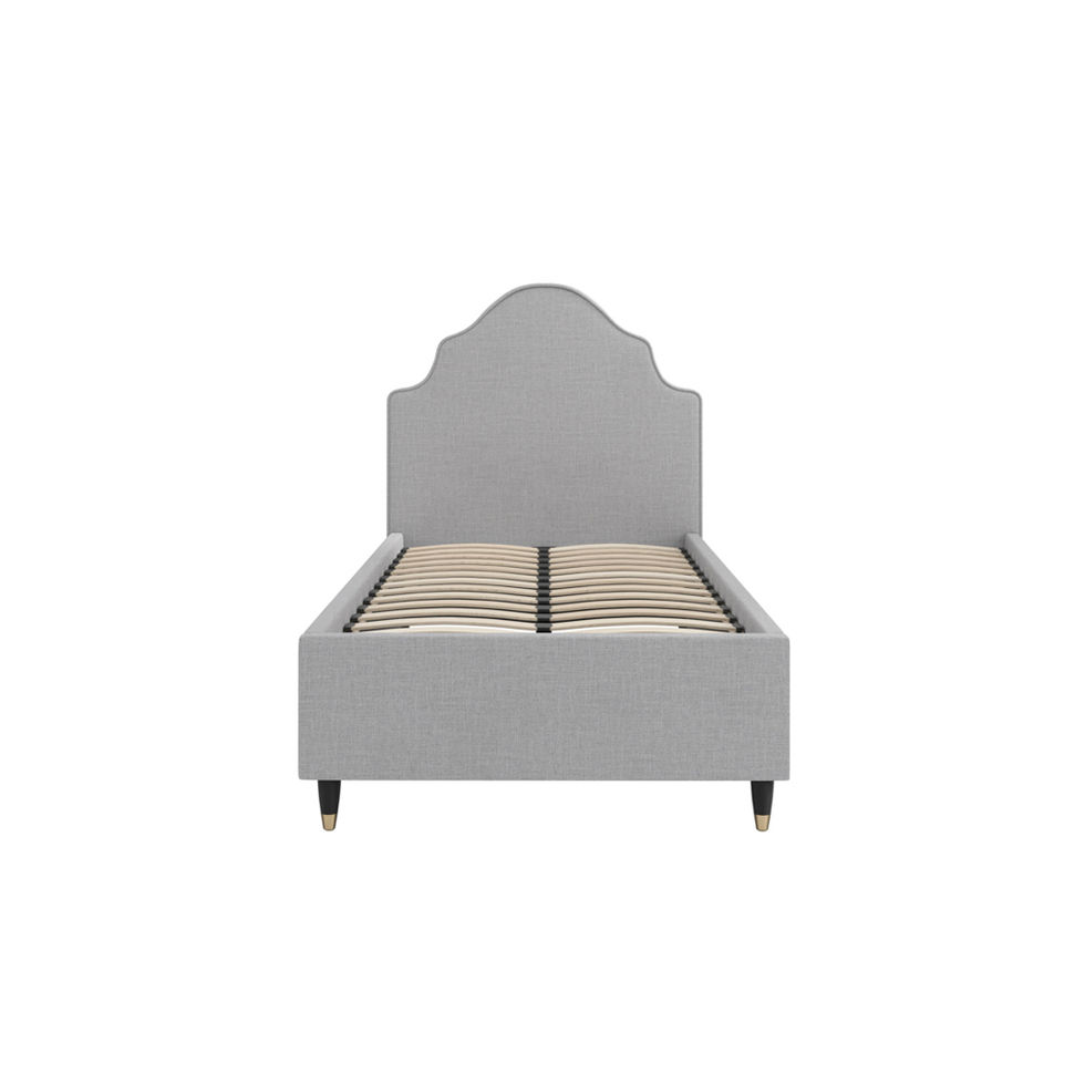 The Monterey Grey Thin Stripe Single Bed features a linen-blend fabric and an ornate, styled headboard. With brass cap details on the legs and sprung slats for added support, this bed brings a touch of luxury to any bedroom.